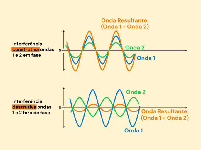 Sempre que duas ou mais ondas sonoras se encontram, elas se somam para formar uma nova onda. Essa nova onda pode ter uma amplitude maior, resultando em um som mais intenso (interferência construtiva), ou uma amplitude menor, produzindo um som mais fraco (interferência destrutiva).