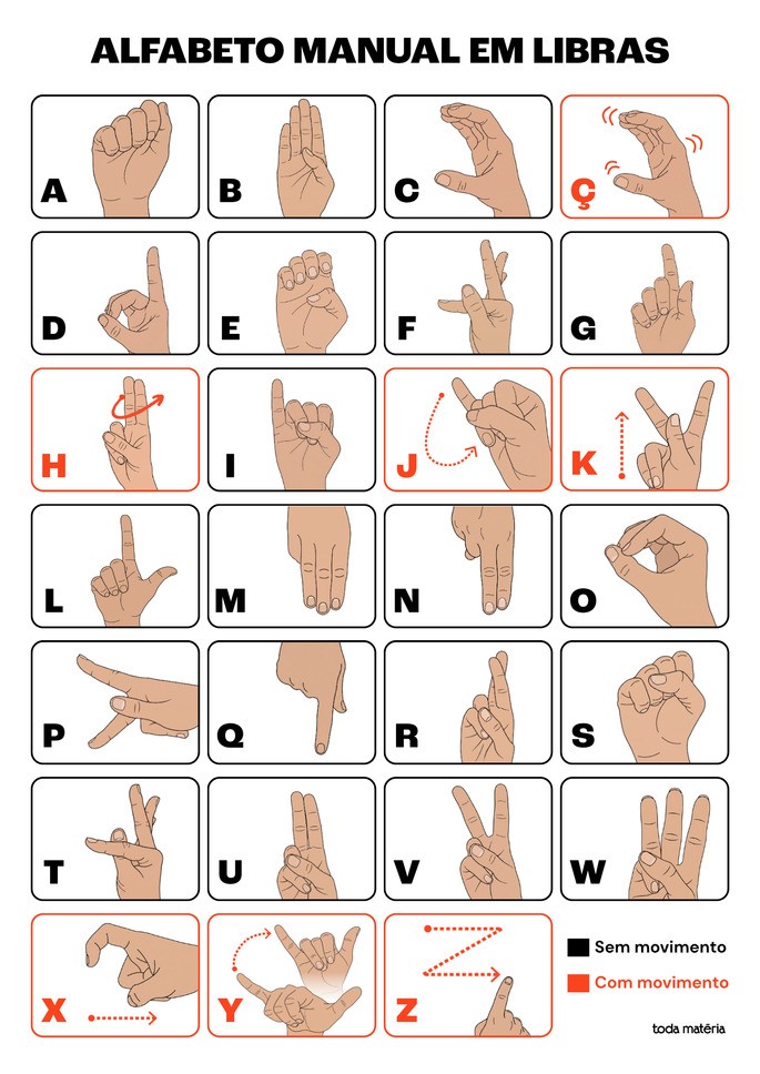 FERNANDES, Márcia. Alfabeto em LIBRAS: conheça todas as letras (para imprimir). Toda Matéria, [s.d.]. Disponível em: https://www.todamateria.com.br/alfabeto-em-libras-conheca-todas-as-letras-para-imprimir/. Acesso em: