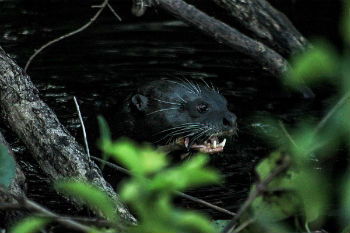 Nos rios, as ariranhas mergulham para encontrar alimento e quando têm a presa na boca, saem da água para comê-las.
