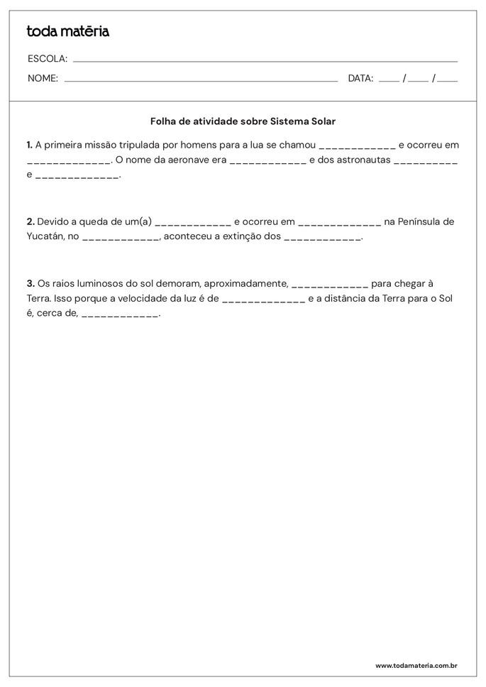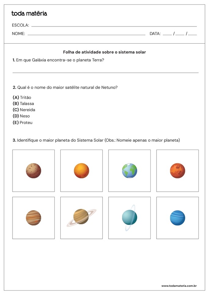 CASTILHO, Rubens. Atividades sobre sistema o solar: desvendando os planetas. Toda Matéria, [s.d.]. Disponível em: https://www.todamateria.com.br/atividade-sobre-o-sistema-solar/. Acesso em: