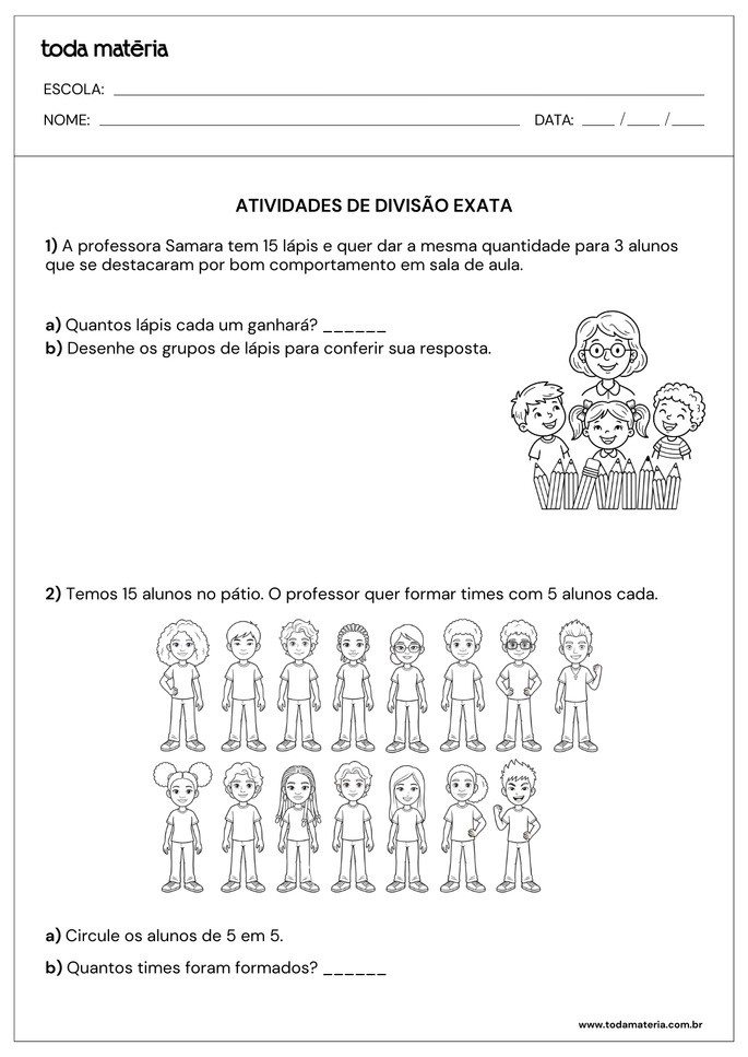 CANELLAS, William. Atividades com divisão exata para 3º ano do Fundamental (para imprimir). Toda Matéria, [s.d.]. Disponível em: https://www.todamateria.com.br/atividades-com-divisao-exata-para-3-ano-do-fundamental-para-imprimir/. Acesso em: