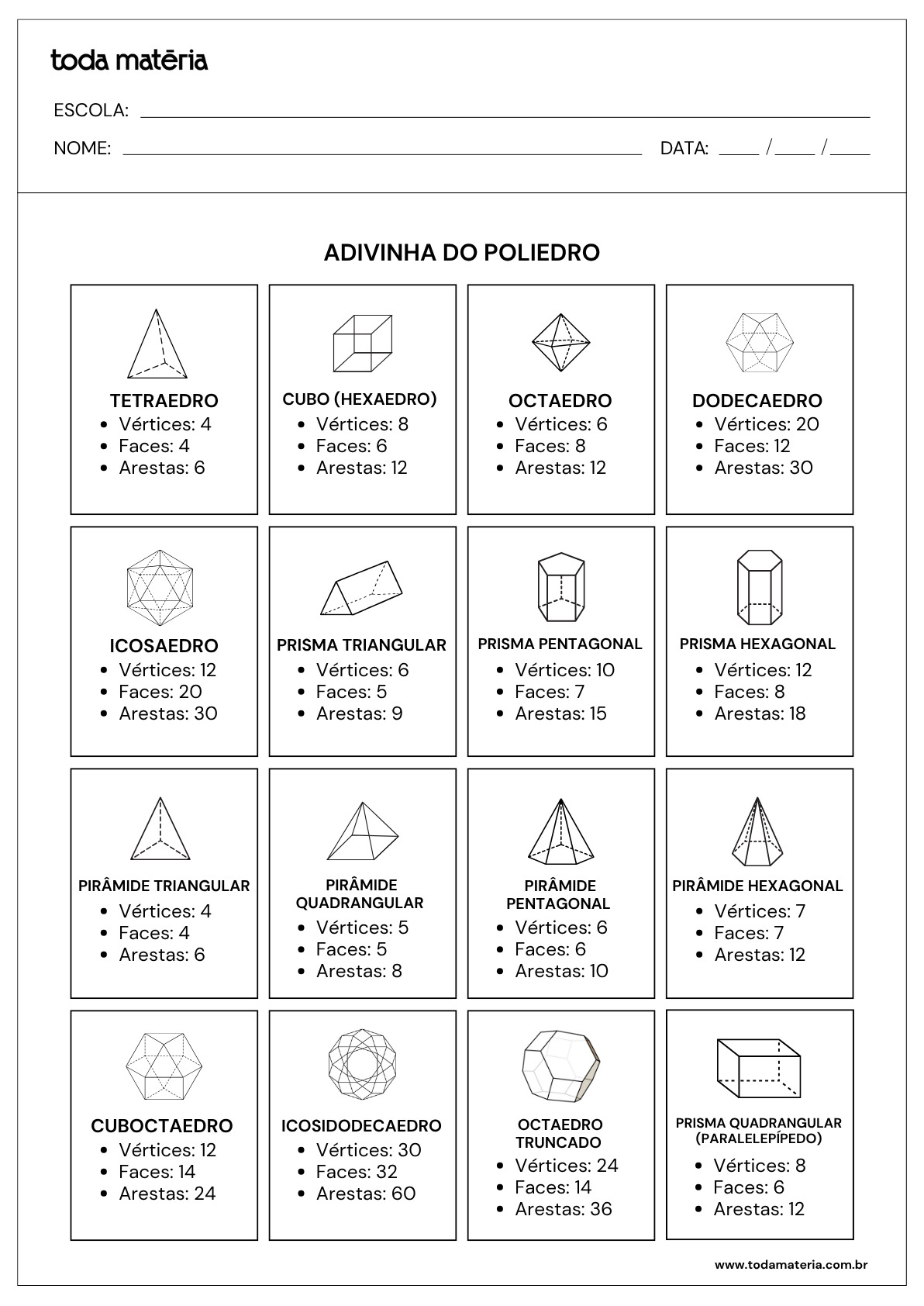 Cartas do jogo Adivinhe o Poliedro para imprimir