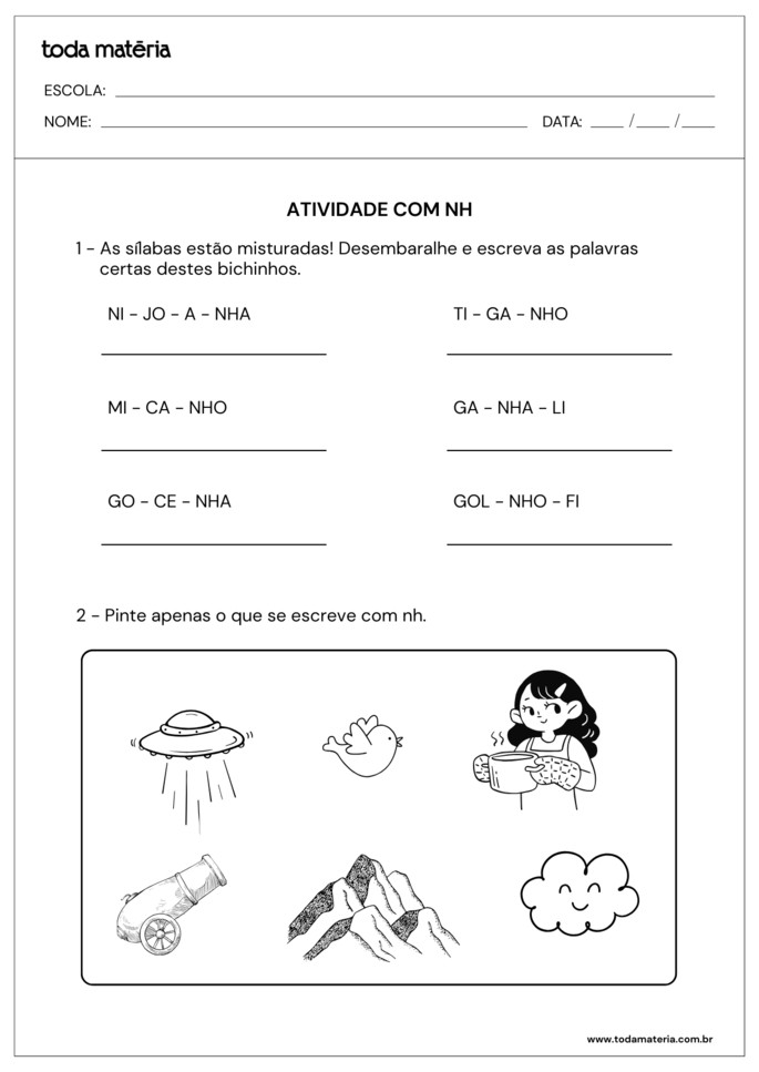 Confira as atividades com NH. As propostas incluem completar palavras, ligar, desembaralhar sílabas, identificar imagens e muito mais — tudo pronto para imprimir e aplicar em sala de aula ou em casa, de forma leve e divertida.