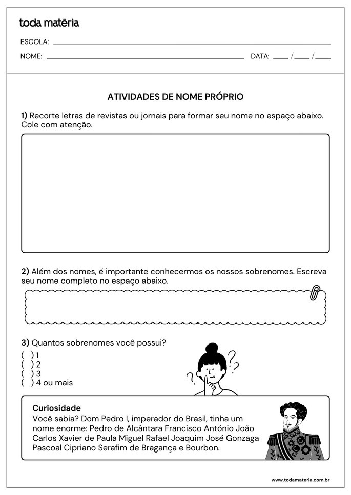 LUIS, Rodrigo. Atividades com o nome próprio para o 1º ano do Fundamental (para imprimir). Toda Matéria, [s.d.]. Disponível em: https://www.todamateria.com.br/atividades-com-o-nome-proprio-para-o-1-ano-do-fundamental-para-imprimir/. Acesso em: