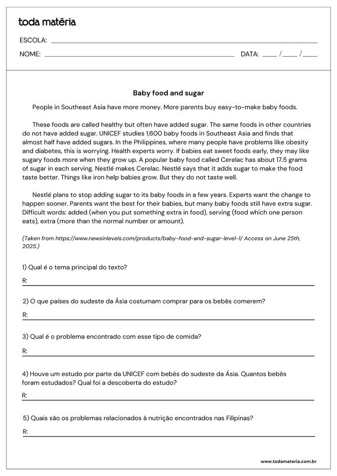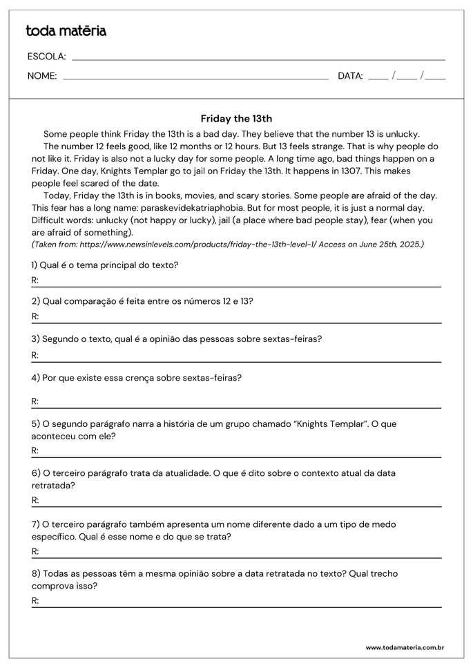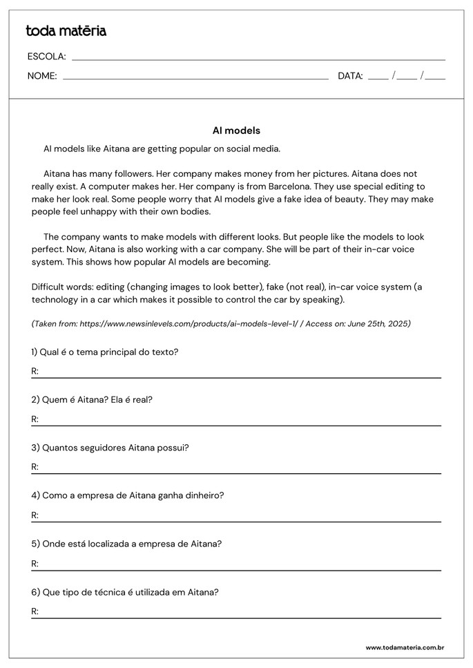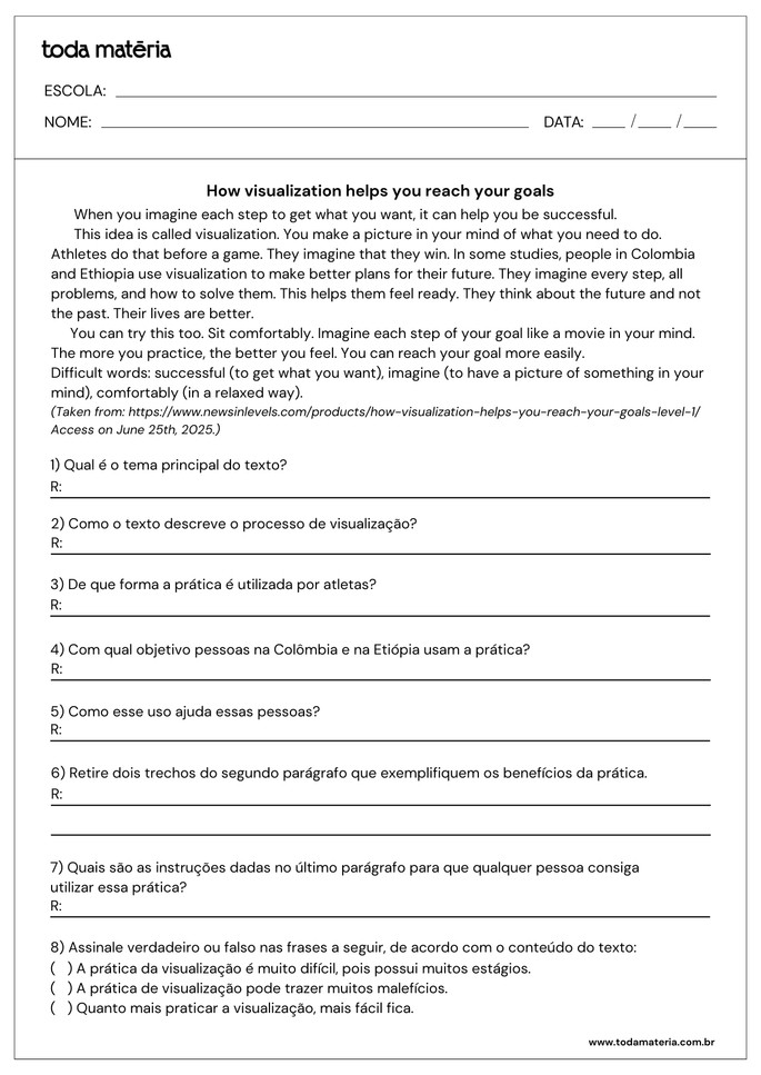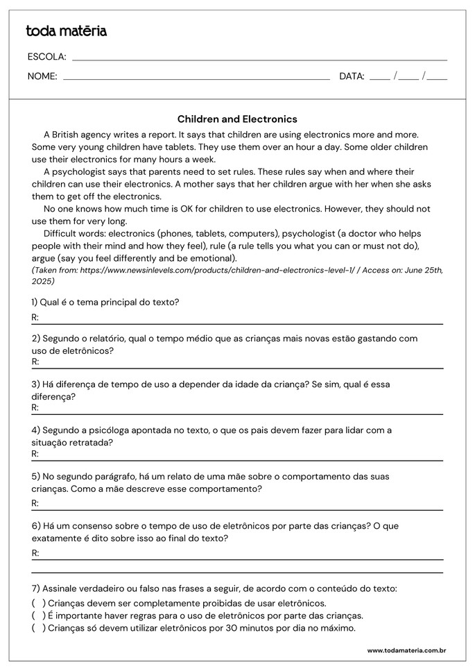 GUIMARÃES, Nathallia. Atividades de leitura e interpretação de textos em inglês (para iniciantes). Toda Matéria, [s.d.]. Disponível em: https://www.todamateria.com.br/atividades-de-leitura-e-interpretacao-de-textos-em-ingles-para-iniciantes/. Acesso em: