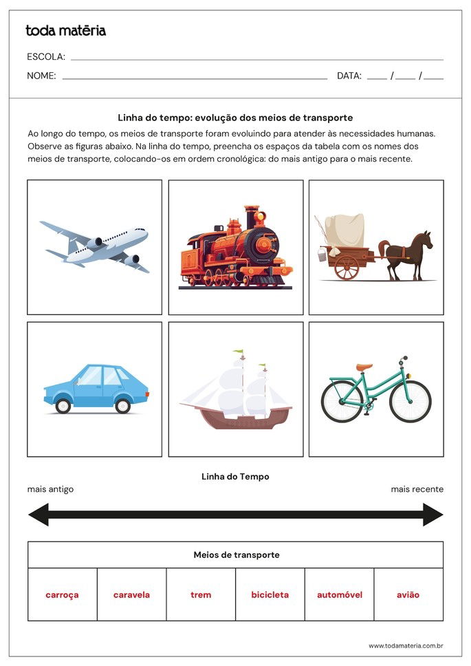 | Proposta | Exercício com linha do tempo dos meios de transporte. |