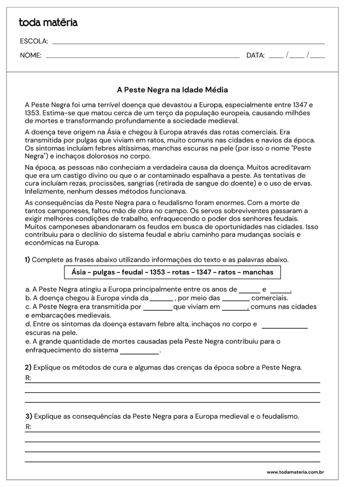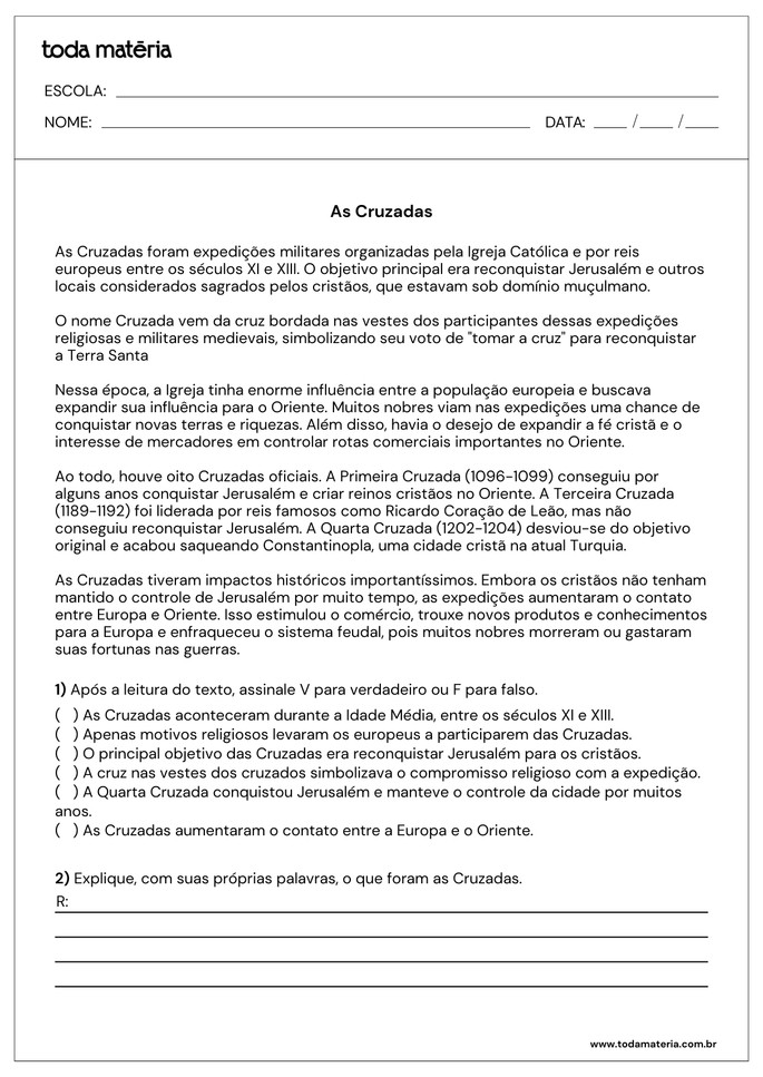 As atividades a seguir abordam a Idade Média, período histórico marcado por profundas transformações políticas, sociais, econômicas e culturais na Europa. O material está pronto para imprimir e acompanha respostas, sendo um recurso prático para o estudo em sala de aula ou para a revisão dos conteúdos de História.