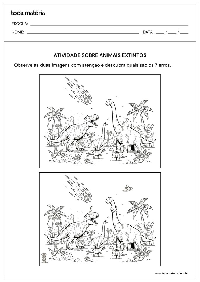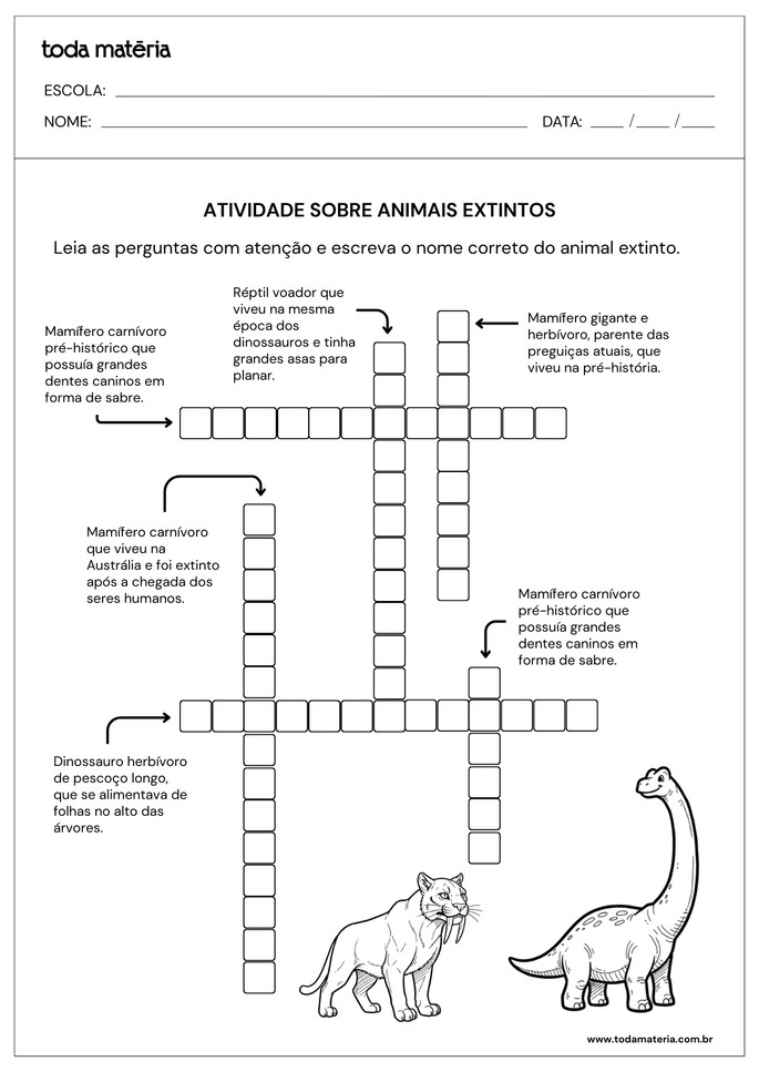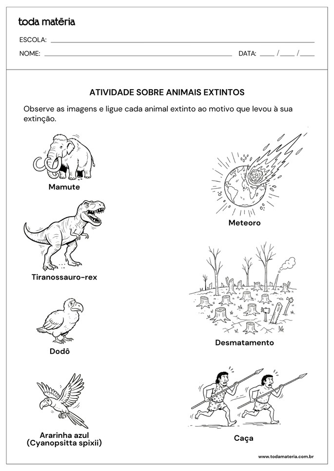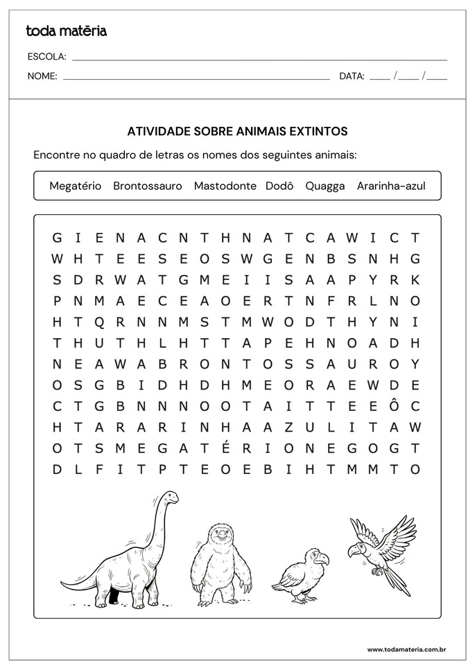 BARCELOS, Eduardo. Atividades sobre animais extintos (prontas para imprimir). Toda Matéria, [s.d.]. Disponível em: https://www.todamateria.com.br/atividades-sobre-animais-extintos-prontas-para-imprimir/. Acesso em: