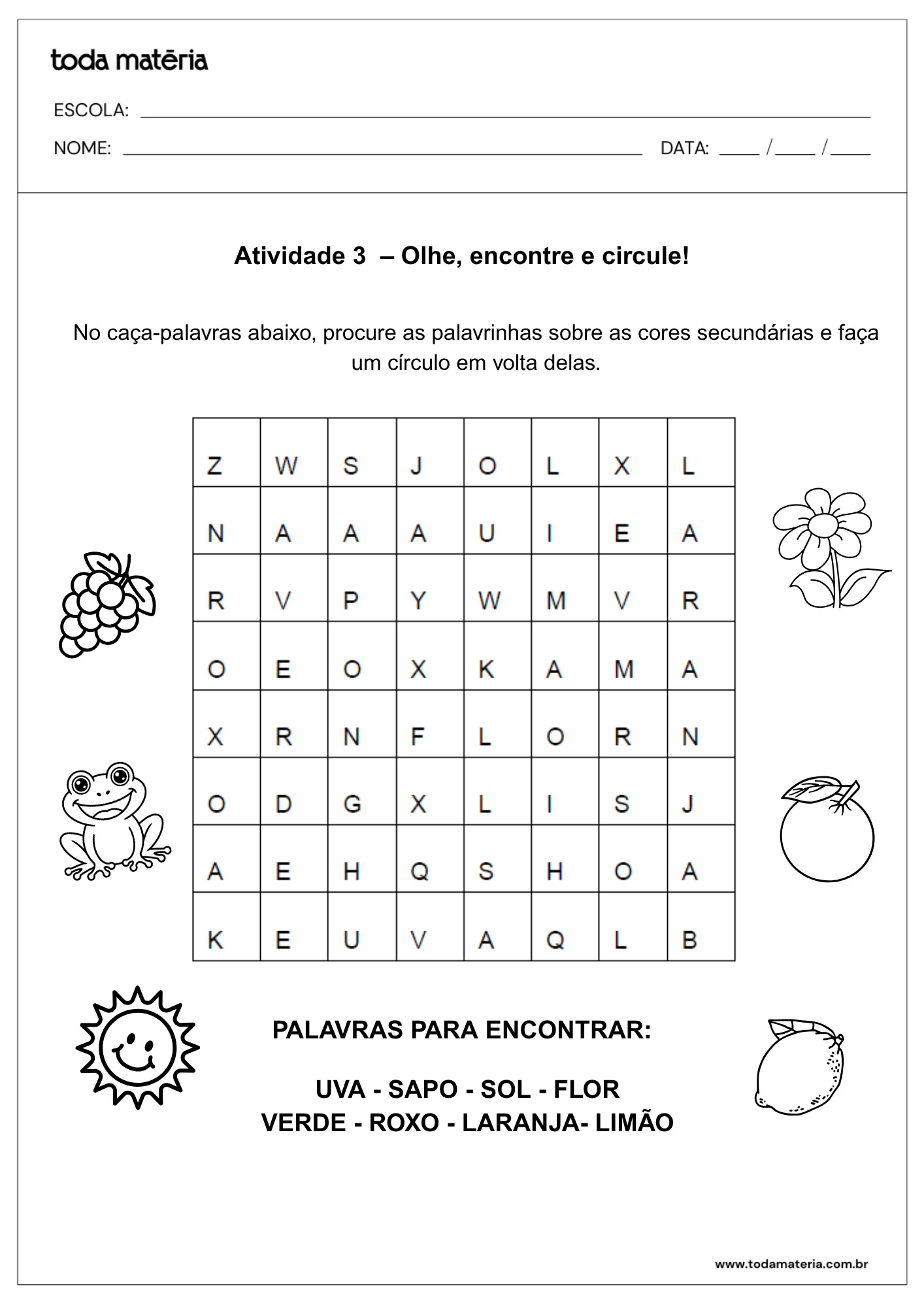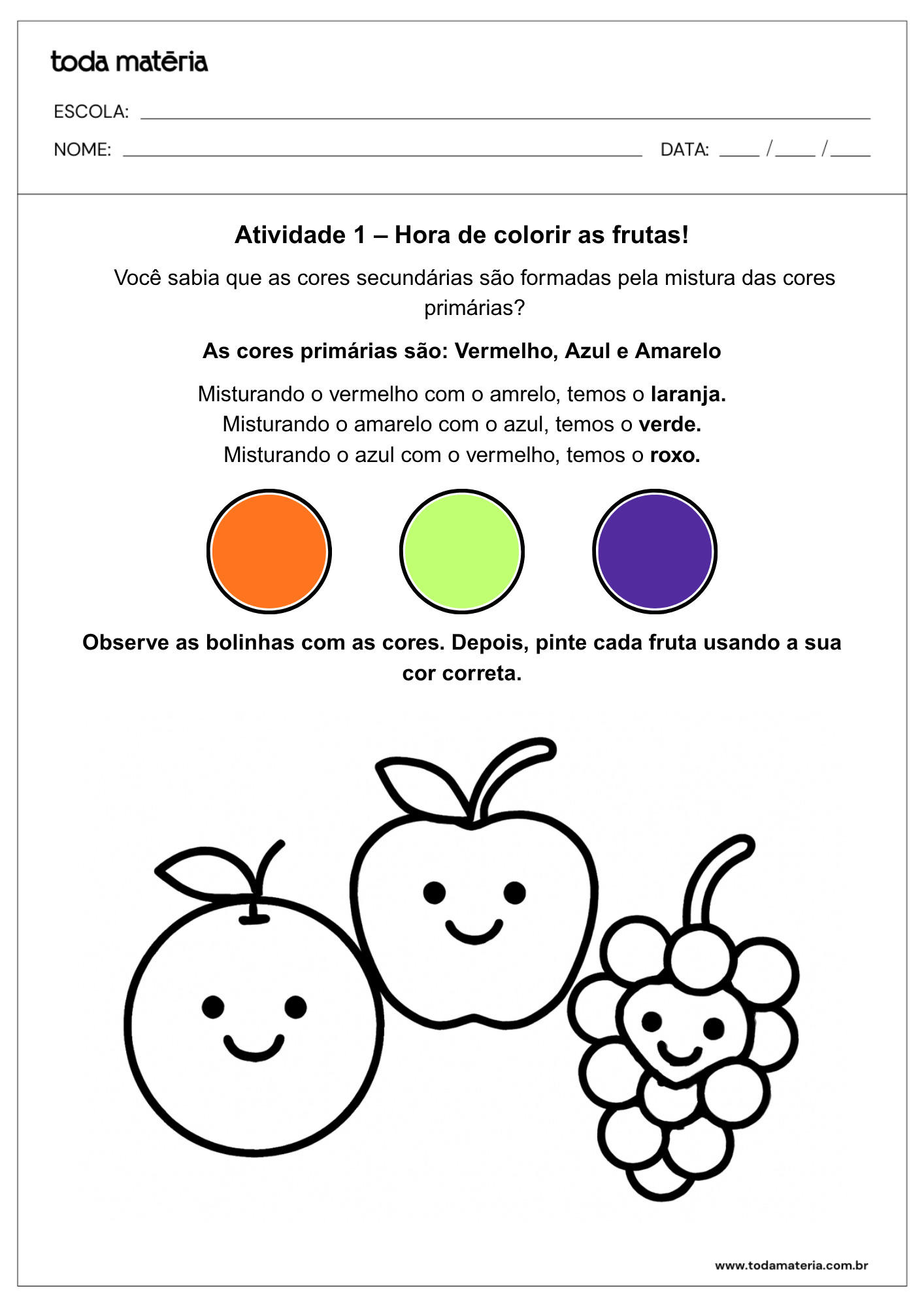 GUERRERO, Kassandra. Atividades sobre as cores secundárias para Educação Infantil (para imprimir). Toda Matéria, [s.d.]. Disponível em: https://www.todamateria.com.br/atividades-sobre-as-cores-secundarias-para-educacao-infantil-para-imprimir/. Acesso em: