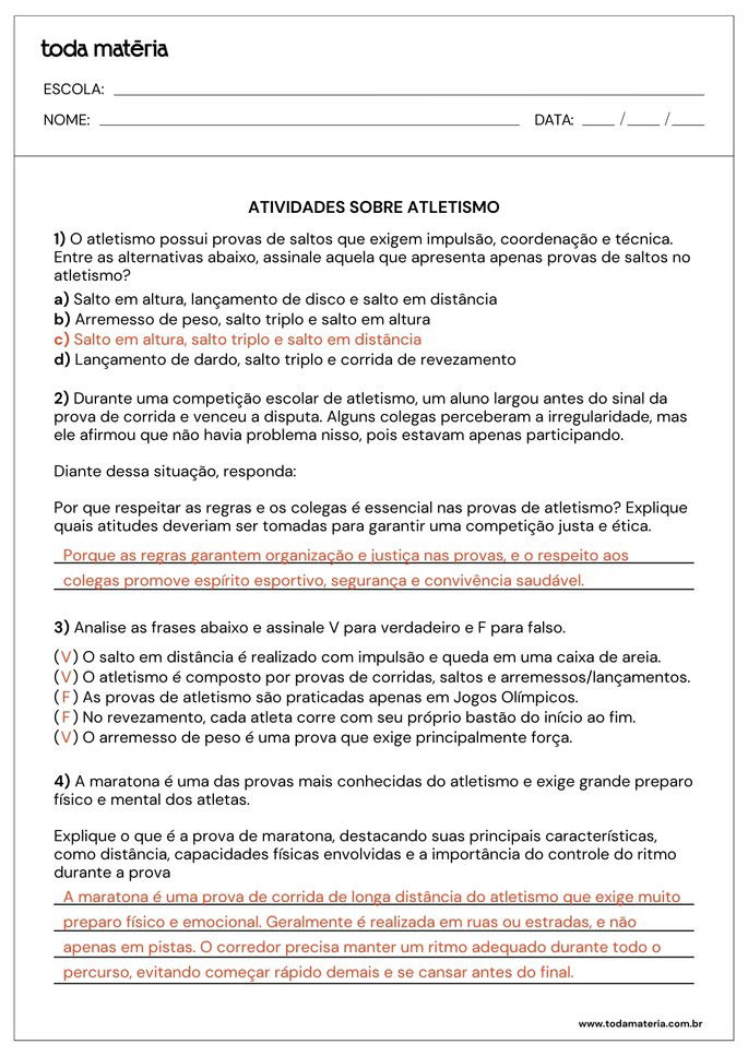 Estas atividades foram elaboradas para auxiliar os alunos a compreender as principais modalidades, regras e materiais do atletismo. Com exercícios variados e prontos para imprimir, o material promove uma aprendizagem dinâmica, reforça os conteúdos trabalhados em aula e estimula o interesse pelo esporte e pela atividade física.