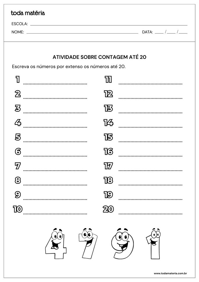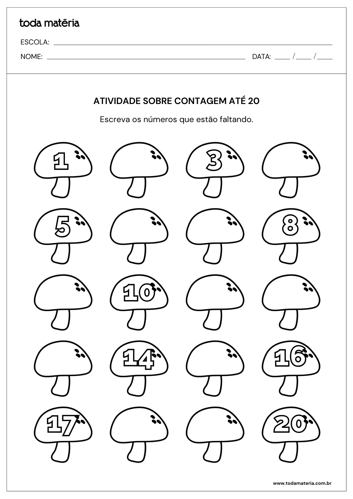 ASTH, Rafael. Atividades sobre contagem de números até 20 (para imprimir). Toda Matéria, [s.d.]. Disponível em: https://www.todamateria.com.br/atividades-sobre-contagem-de-numeros-ate-20-para-imprimir/. Acesso em: