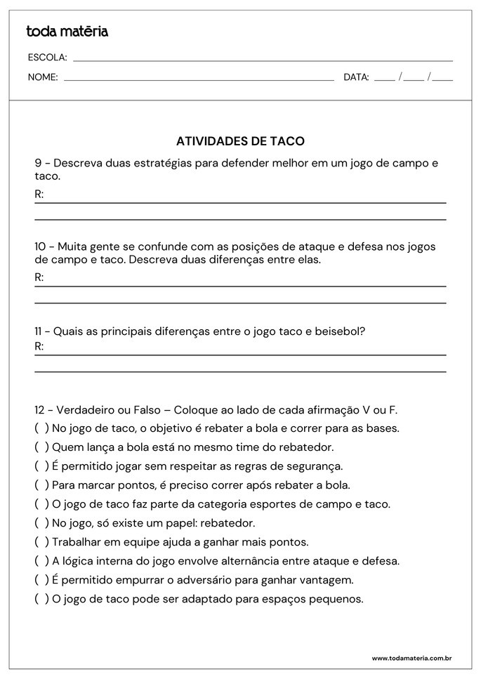 TOLEDO, Júlia. Atividades sobre esportes de campo e taco (para imprimir). Toda Matéria, [s.d.]. Disponível em: https://www.todamateria.com.br/atividades-sobre-esportes-de-campo-e-taco-para-imprimir/. Acesso em: