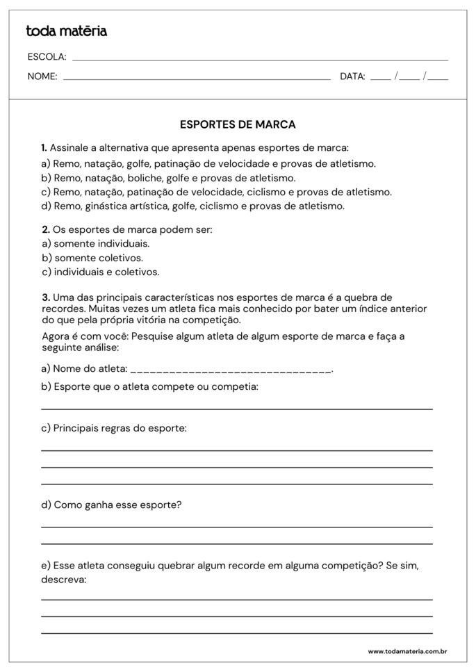 BARRETO, Mariama. Atividades sobre esportes de marca (para imprimir). Toda Matéria, [s.d.]. Disponível em: https://www.todamateria.com.br/atividades-sobre-esportes-de-marca-para-imprimir/. Acesso em: