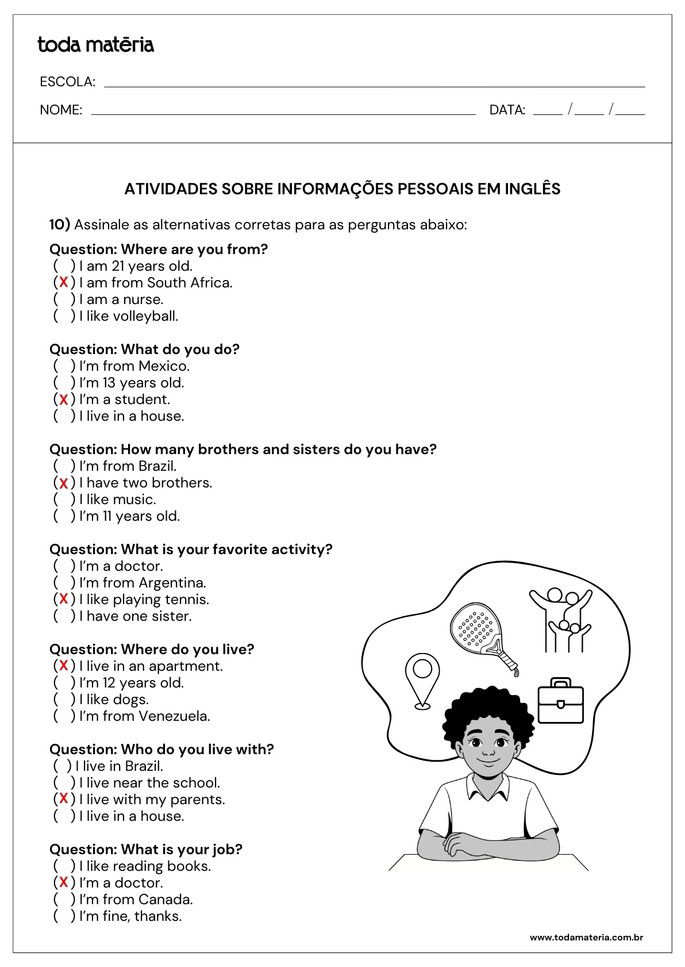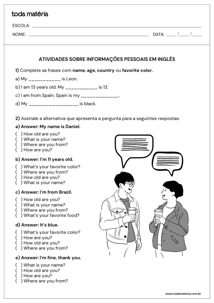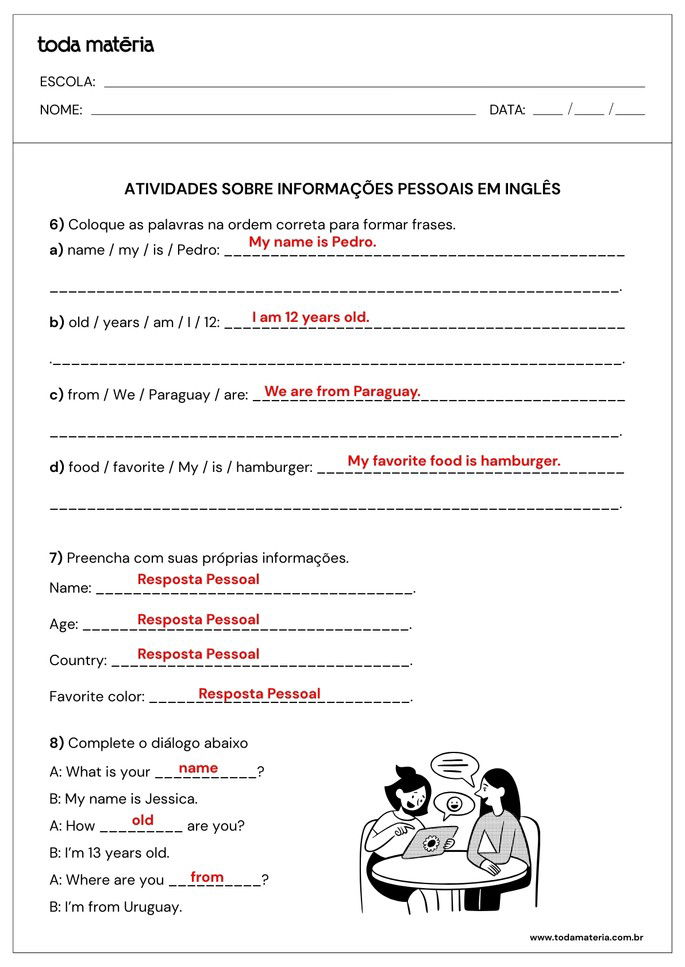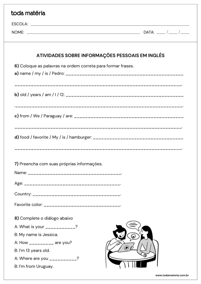 GUIMARÃES, Nathallia. Atividades sobre informações pessoais em inglês (personal information). Toda Matéria, [s.d.]. Disponível em: https://www.todamateria.com.br/atividades-sobre-informacoes-pessoais-em-ingles-personal-information/. Acesso em: