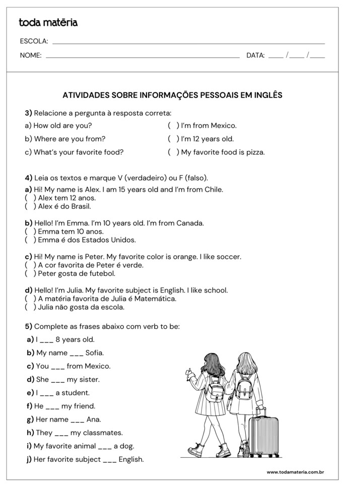 As informações pessoais em inglês (personal information) são usadas para se apresentar, preencher formulários e iniciar conversas. Nesta lista de atividades prontas para imprimir, os alunos poderão praticar vocabulário e estruturas simples por meio de exercícios variados, como completar, ordenar, identificar erros e responder questões, fortalecendo a compreensão e o uso correto desse conteúdo.