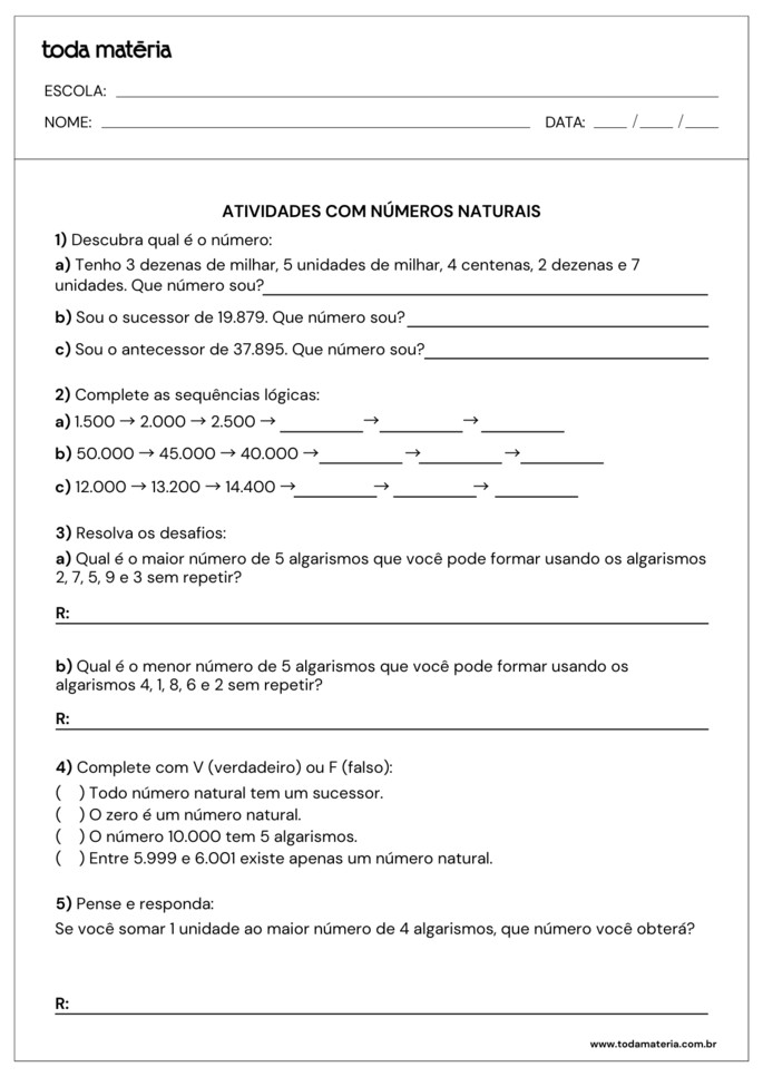 CANELLAS, William. Atividades sobre números naturais (prontas para imprimir). Toda Matéria, [s.d.]. Disponível em: https://www.todamateria.com.br/atividades-sobre-numeros-naturais-prontas-para-imprimir/. Acesso em: