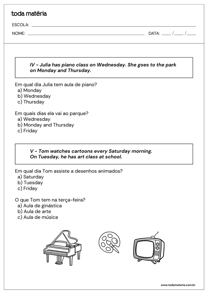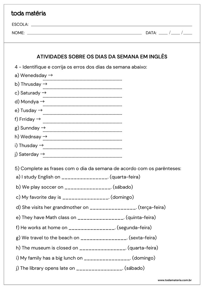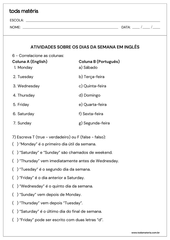 GUIMARÃES, Nathallia. Atividades sobre os dias da semana em inglês (days of the week) para imprimir. Toda Matéria, [s.d.]. Disponível em: https://www.todamateria.com.br/atividades-sobre-os-dias-da-semana-em-ingles-days-of-the-week-para-imprimir/. Acesso em: