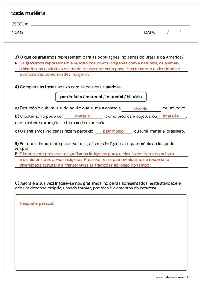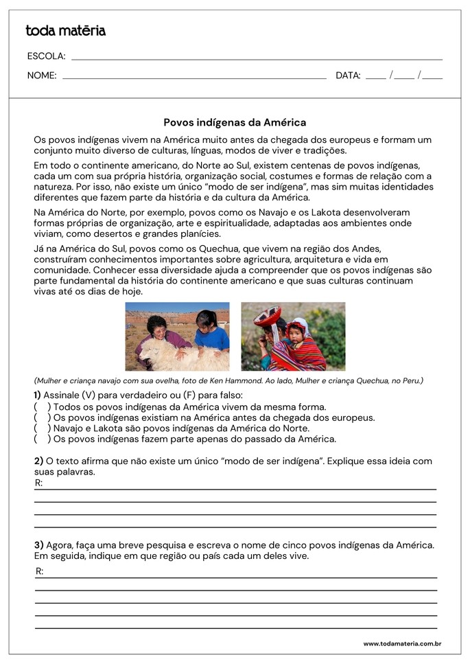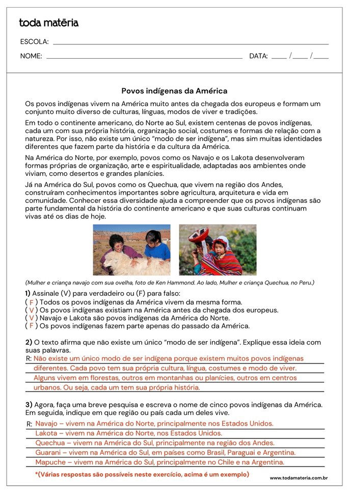 As atividades a seguir têm como objetivo ampliar o conhecimento sobre os povos indígenas das Américas, valorizando sua diversidade cultural, social e histórica. Por meio de exercícios variados, os alunos são convidados a refletir sobre os modos de vida, saberes e expressões artísticas indígenas. O material está pronto para imprimir e conta com respostas, sendo um recurso prático para o trabalho em sala de aula ou para estudos em casa.