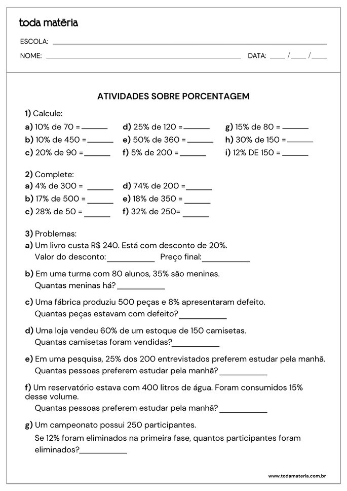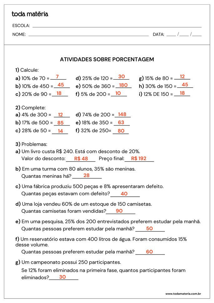 CANELLAS, William. Atividades sobre porcentagem para o 5º ano (para imprimir). Toda Matéria, [s.d.]. Disponível em: https://www.todamateria.com.br/atividades-sobre-porcentagem-para-o-5-ano-para-imprimir/. Acesso em: