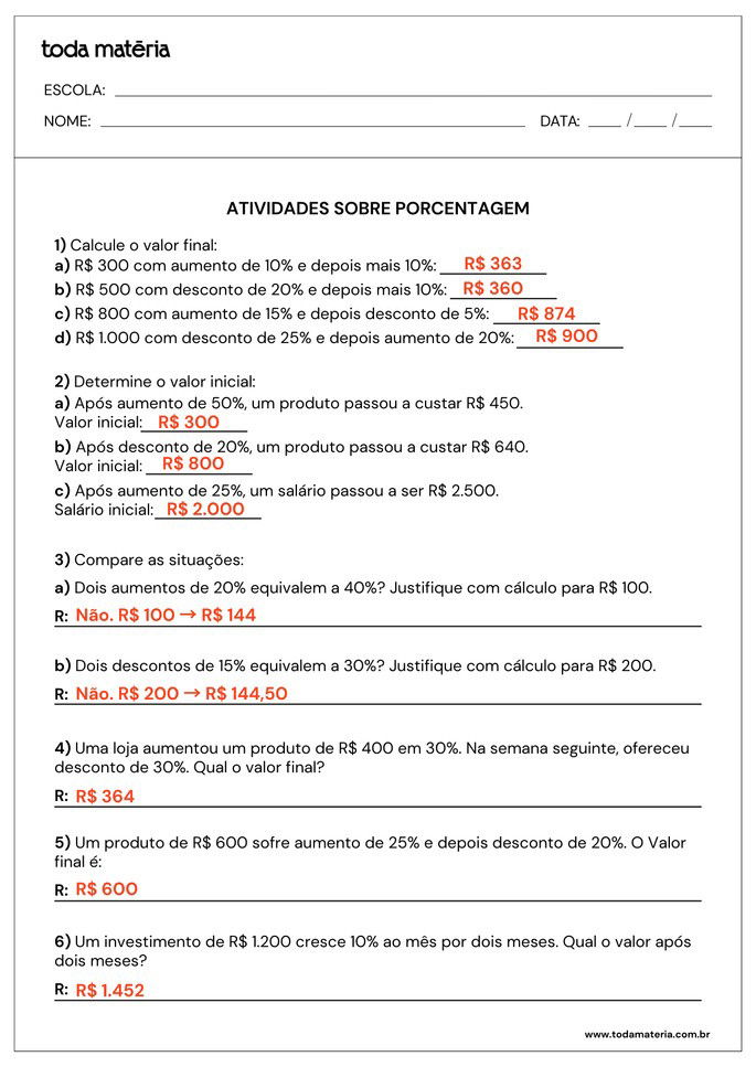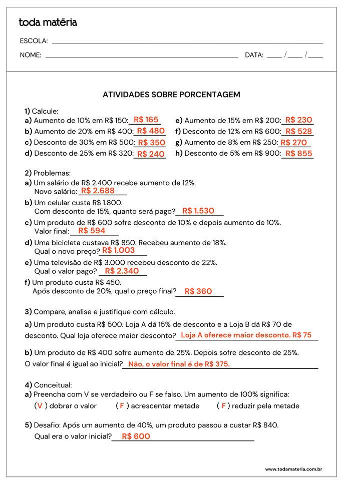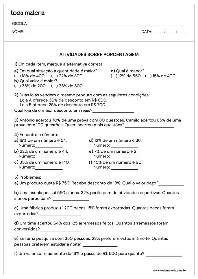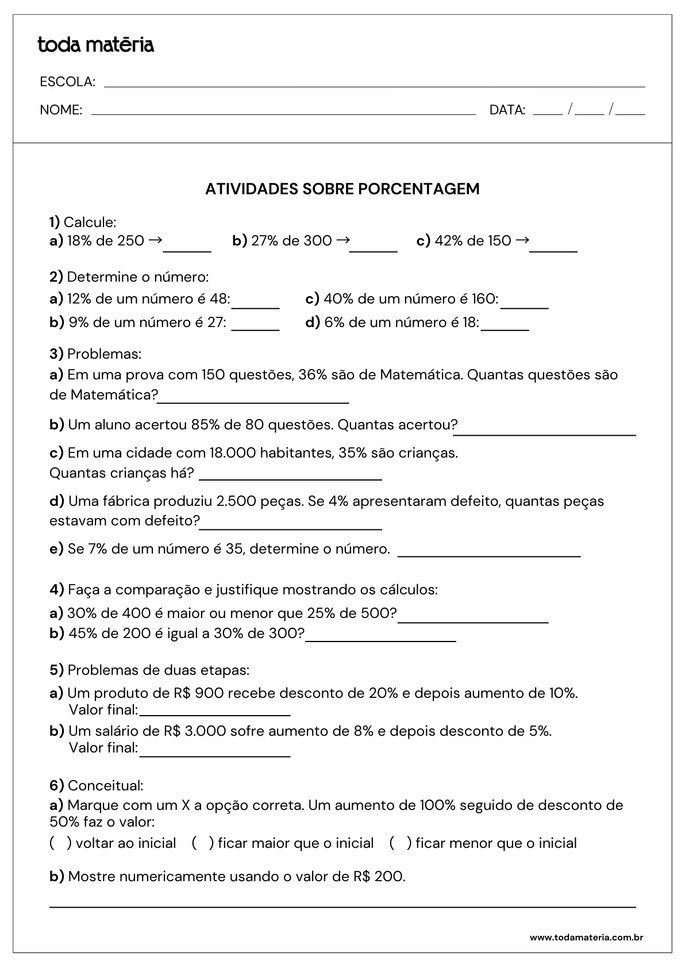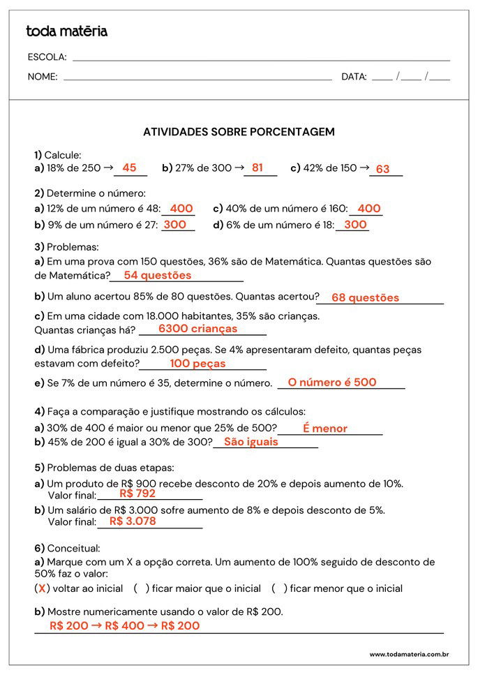 A porcentagem está presente em diversas situações do cotidiano, como descontos, aumentos e comparações. Para ajudar na aprendizagem, reunimos atividades prontas para imprimir, com exercícios variados e problemas contextualizados. O material inclui questões de cálculo, interpretação e comparação, além de gabarito para conferência. Aproveite para reforçar o conteúdo de forma prática e eficiente!