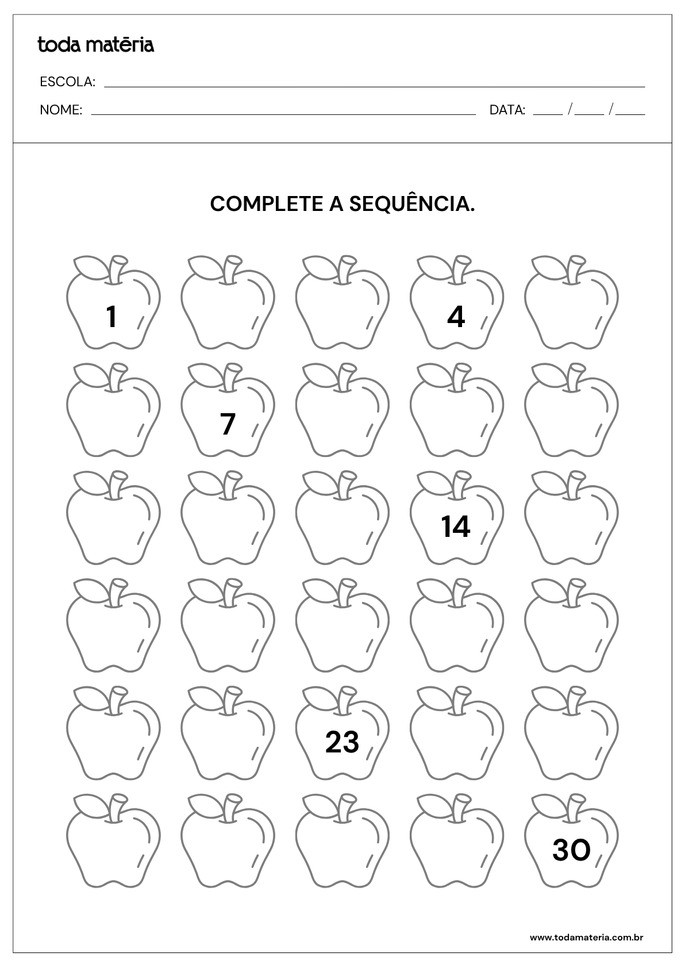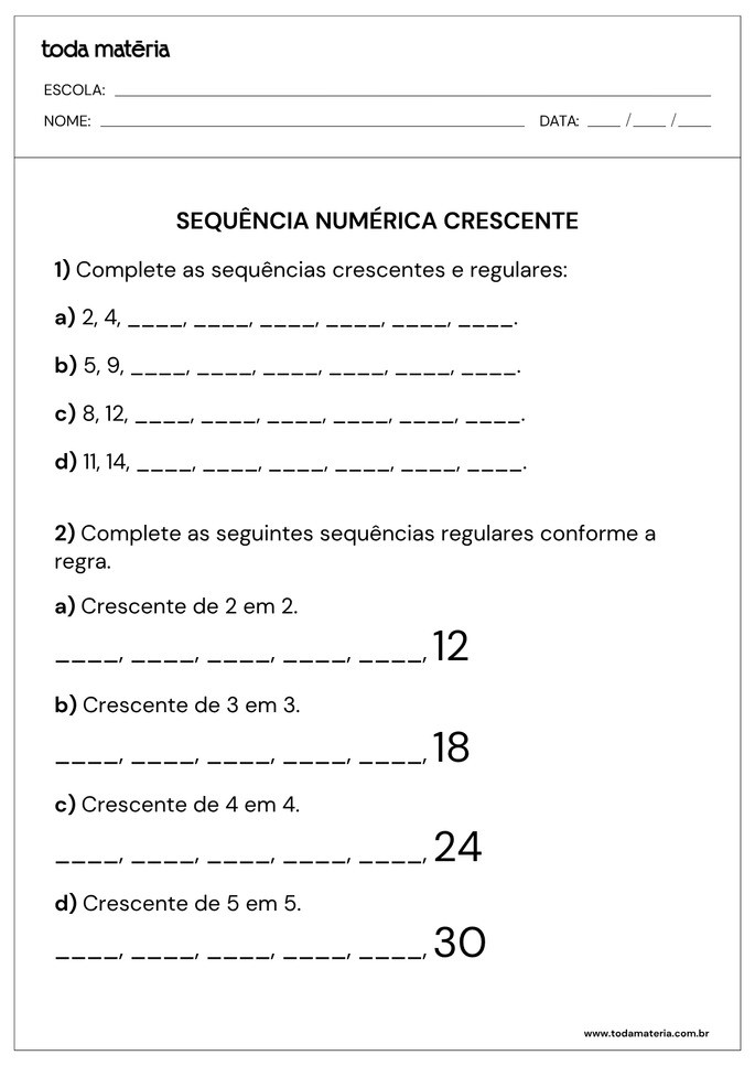 ASTH, Rafael. Atividades sobre sequência numérica crescente (para imprimir). Toda Matéria, [s.d.]. Disponível em: https://www.todamateria.com.br/atividades-sobre-sequencia-numerica-crescente-para-imprimir/. Acesso em: