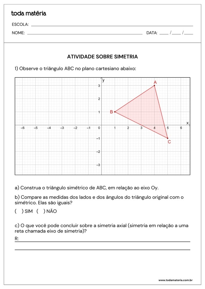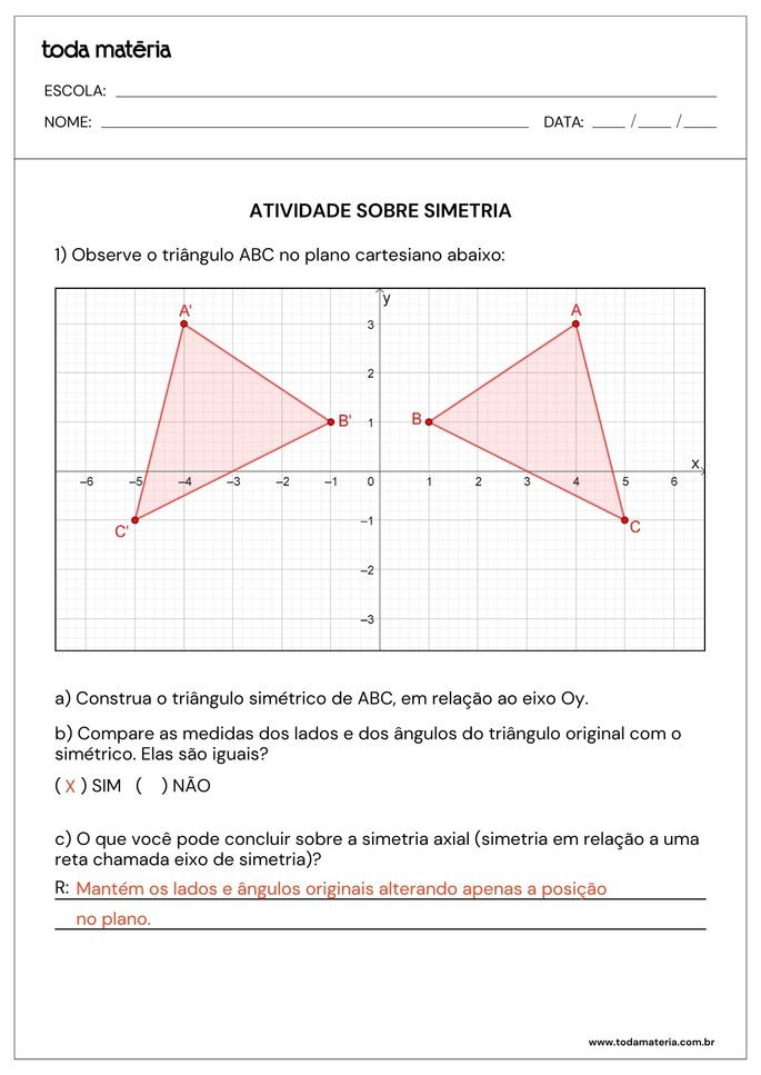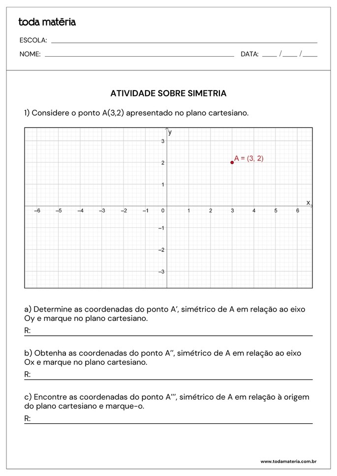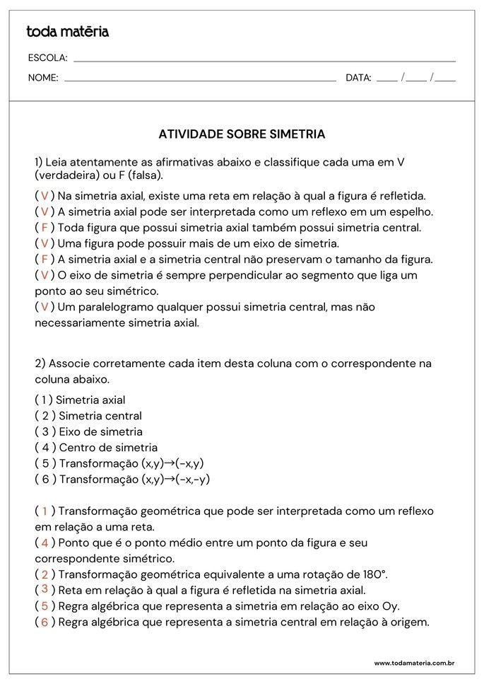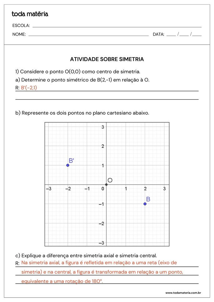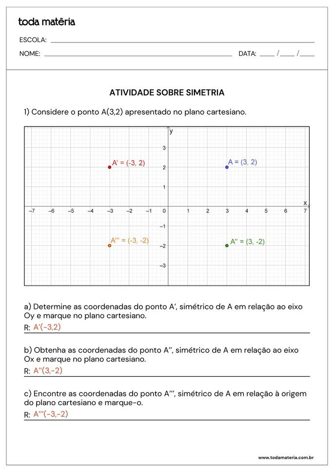 A simetria é um conceito matemático presente em diversas formas da natureza, da arte e da geometria, e está relacionada à ideia de equilíbrio e correspondência entre partes de uma figura. As atividades a seguir, prontas para imprimir, auxiliam os estudantes a compreender esse conceito por meio da observação, da análise em planos cartesianos e da resolução de diferentes tipos de exercícios.