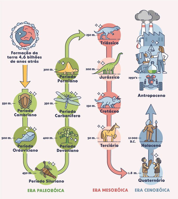 O planeta Terra é dividido em três eras geológicas: a Paleozoica, a Mesozoica e a Cenozoica. Cada uma dessas eras são divididas em períodos, os períodos em épocas e assim por diante.