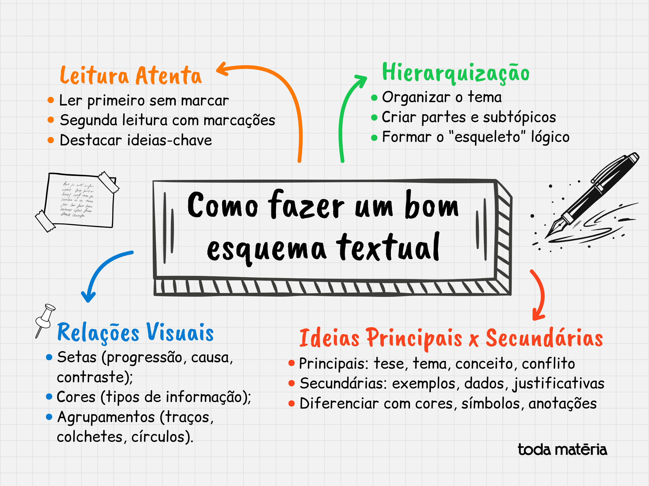 LUIS, Rodrigo. Esquemas textuais: entenda o que são e como são feitos (com exemplos). Toda Matéria, [s.d.]. Disponível em: https://www.todamateria.com.br/esquemas-textuais-entenda-o-que-sao-e-como-sao-feitos-com-exemplos/. Acesso em: