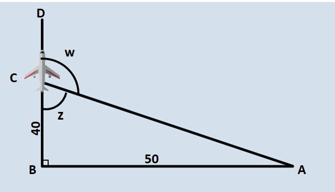 Um avião decolou da cidade A e voou 50 km em linha reta até pousar na cidade B. Após, voou mais 40 km, dessa vez indo na direção da cidade D. Essas duas rotas fazem um ângulo de 90° entre si. No entanto, devido às condições climáticas desfavoráveis, o piloto recebeu um comunicado da torre de comando informando que não poderia pousar na cidade D e, que deveria voltar para a cidade A.