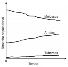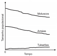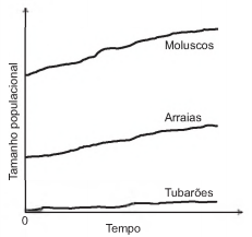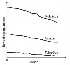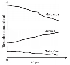 Qual das figuras representa a variação do tamanho populacional de tubarões, arraias e moluscos no Atlântico Norte, a partir do momento em que a pesca de tubarões foi iniciada (tempo zero)?