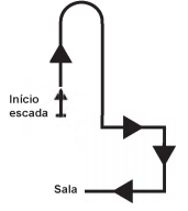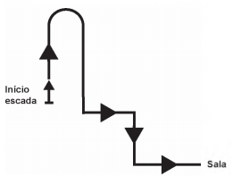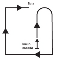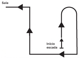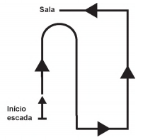 Uma pessoa pede informação na recepção de um prédio comercial de como chegar a uma sala, e recebe as seguintes instruções: suba a escada em forma de U à frente, ao final dela vire à esquerda, siga um pouco à frente e em seguida vire à direita e siga pelo corredor. Ao final do corredor, vire à direita.