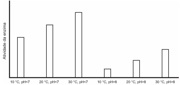 Sabendo-se que as enzimas podem ter sua atividade regulada por diferentes condições de temperatura e pH, foi realizado um experimento para testar as condições ótimas para a atividade de uma determinada enzima. Os resultados estão apresentados no gráfico.
