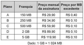 Os consumidores X, Y e Z desejam trocar seus planos de internet móvel na tentativa de obterem um serviço de melhor qualidade. Após pesquisarem, escolheram uma operadora que oferece cinco planos para diferentes perfis, conforme apresentado no quadro.