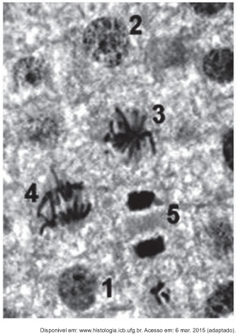 Para estudar os cromossomos, é preciso observá-los no momento em que se encontram no ponto máximo de sua condensação. A imagem corresponde ao tecido da raiz de cebola, visto ao microscópio, e cada número marca uma das diferentes etapas do ciclo celular.