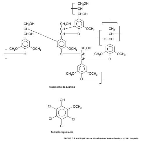 O papel tem na celulose sua matéria-prima, e uma das etapas de sua produção é o branqueamento, que visa remover a lignina da celulose. Diferentes processos de branqueamento usam, por exemplo, cloro (Cl2 ), hipoclorito de sódio (NaClO), oxigênio (O2 ), ozônio (O3 ) ou peróxido de hidrogênio (H2O2 ). Alguns processos de branqueamento levam à formação de compostos organoclorados. São apresentadas as estruturas de um fragmento da lignina e do tetracloroguaiacol, um dos organoclorados formados no processo de branqueamento.