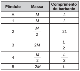 Durante uma aula experimental de física, os estudantes construíram um sistema ressonante com pêndulos simples. As características de cada pêndulo são apresentadas no quadro. Inicialmente, os estudantes colocaram apenas o pêndulo A para oscilar.