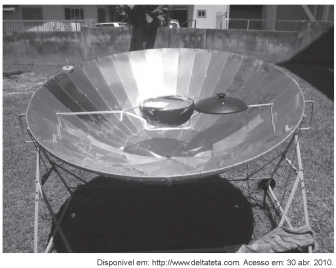 A figura mostra uma superfície refletora de formato parabólico, que tem sido utilizada como um fogão solar. Esse dispositivo é montado de tal forma que a superfície fique posicionada sempre voltada para o Sol. Neste, a panela deve ser colocada em um ponto determinado para maior eficiência do fogão.