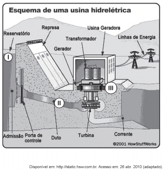 A figura respresenta o processo mais usado nas hidrelétricas para obtenção de energia elétrica no Brasil. As transformações de energia nas posições I→II e II→III da figura são, respectivamente,