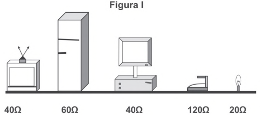 Uma residência possui dois aparelhos de TV, duas geladeiras, um computador, um ferro elétrico e oito lâmpadas incandescentes. A resistência elétrica de cada equipamento está representada pela figura I. A tensão elétrica que alimenta a rede da residência é de 120 V.