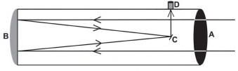 A luz emitida por um astro penetra no telescópio pelo orifício na posição A, reflete no espelho parabólico localizado na posição B, é novamente refletida pelo espelho C em direção às lentes localizadas na ocular do telescópio (local onde o observador aproxima o olho) na posição D. Essa lente forma uma imagem real e maior do objeto observado, um pouco à frente de D. Por isso, o observador não deve encostar seus olhos na lente para enxergar essa imagem.