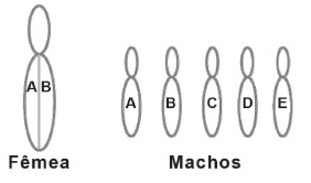 Supondo que uma fêmea com genótipo AB se acasale com cinco machos com genótipos diferentes A, B, C, D e E, conforme o esquema. Qual a porcentagem de machos na prole desta fêmea?