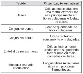 Os tecidos animais descritos no quadro são formados por um conjunto de células especializadas, e a organização estrutural de cada um reflete suas respectivas funções.