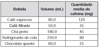 O quadro apresenta o teor de cafeína em diferentes bebidas comumente...