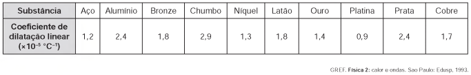 O quadro oferece os coeficientes de dilatação linear de alguns metais e ligas metálicas: