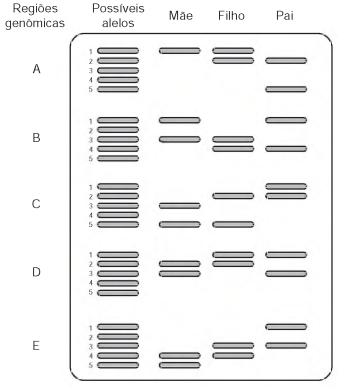 Na investigação de paternidade por análise de DNA, avalia-se o perfil genético da mãe, do suposto pai e do filho pela análise de regiões do genoma das pessoas envolvidas. Cada indivíduo apresenta um par de alelos, iguais ou diferentes, isto é, são homozigotos ou heterozigotos, para cada região genômica. O esquema representa uma eletroforese com cinco regiões genômicas (classificadas de A a E), cada uma com cinco alelos (1 a 5), analisadas em uma investigação de paternidade: