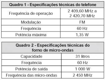 Os fornos domésticos de micro-ondas trabalham com uma frequência de ondas eletromagnéticas que atuam fazendo rotacionar as moléculas de água, gordura e açúcar e, consequentemente, fazendo com que os alimentos sejam aquecidos. Os telefones sem fio também usam ondas eletromagnéticas na transmissão do sinal. As especificações técnicas desses aparelhos são informadas nos quadros 1 e 2, retirados de seus manuais.