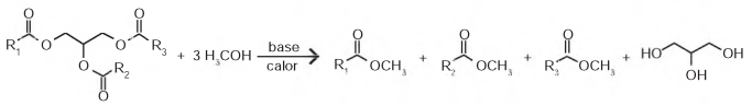 Um dos métodos de produção de biodiesel envolve a transesterificação do óleo de soja utilizando metanol em meio básico (NaOH ou KOH), que precisa ser realizada na ausência de água. A figura mostra o esquema reacional da produção de biodiesel, em que R representa as diferentes cadeias hidrocarbônicas dos ésteres de ácidos graxos.