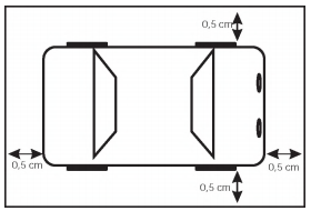 Um jornaleiro irá receber 21 revistas. Cada uma terá um carrinho na escala de 1:43 do tamanho real acompanhando-a em caixinha à parte. Os carrinhos são embalados com folga de 0,5 cm nas laterais, como indicado na figura. Assim, o jornaleiro reservou três prateleiras com 95 cm de comprimento por 7 cm de largura, onde as caixas serão acomodadas de forma a caberem inteiramente dentro de cada prateleira. Além disso, sabe-se que os carrinhos são cópias dos modelos reais que possuem 387 cm de comprimento por 172 cm de largura.