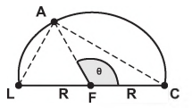 Durante seu treinamento, um atleta percorre metade de uma pista circular de raio R, conforme figura a seguir. A sua largada foi dada na posição representada pela letra L, a chegada está representada pela letra C e a letra A representa o atleta. O segmento LC é um diâmetro da circunferência e o centro da circunferência está representado pela letra F.