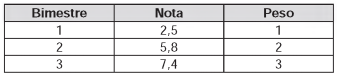 Uma aluna registrou as notas de matemática obtidas nos 3 primeiros bimestres do ano letivo e seus respectivos pesos no quadro a seguir.